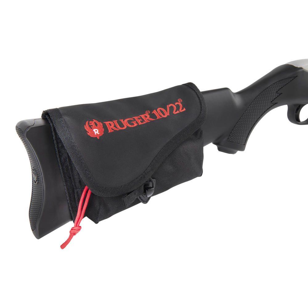 The Ruger 10/22 Buttstock Pouch has a protective flap and a quiet, comfortable cover. Holds 10-round magazines and ammo.