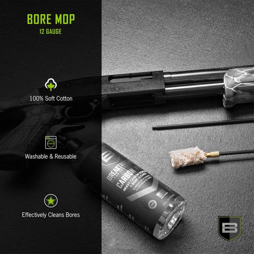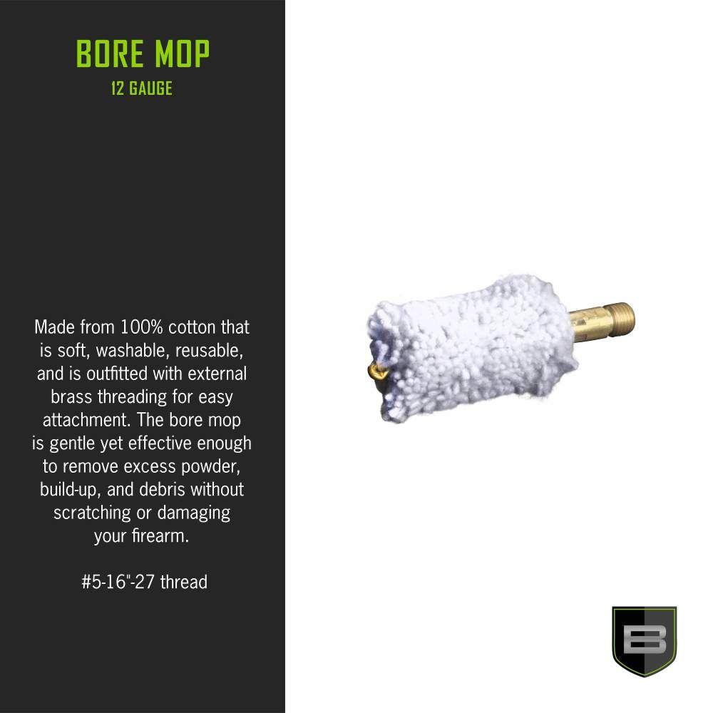 - GUN CLEANING SUPPLIES: Get the best clean without scratching or damaging your rifling. This 12-gauge bore mop is made from 100% cotton that is soft, washable, reusable, & is outfitted with external brass threading for easy attachment.