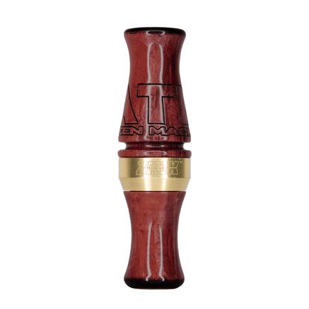 The ATM Green Machine Custom Deluxe Duck Call is constructed with beautiful African Padauk wood, featuring a matching mouthpiece and end piece for a seamless design. It is brass banded and comes with custom laser engraving for a distinctive, personalized touch. The call features Zink's non-stick Z-cut tone channel and a double reed J-frame, ensuring smooth, responsive performance for duck calling enthusiasts.