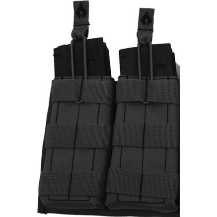 Durable open-top double magazine pouch. Molle web backing for user customization and attachment to most carriers, bags, and tactical gear. Holds 2-AR15, AR10, AK47, and other carbine and tactical magazines