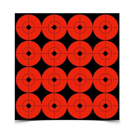 Self-adhesive, fluorescent red target spots create instant bulls-eye for all types of target practice. The high contrast, radiant red color lets you see a sharper sight picture and bullet holes more clearly for better scores and smaller groups. And a perforated back panel makes this package into a handy target spot dispenser.