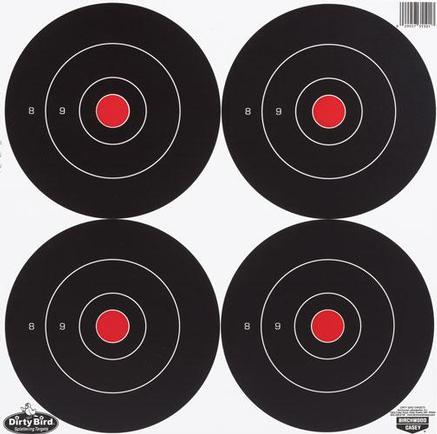 Multiple target facings on one sheet make for more shooting time and less target changing time. (9) - 3" targets or (4) - 6" targets on one convenient sheet. Each Dirty Bird target comes with an aiming point for open or scoped sights.
