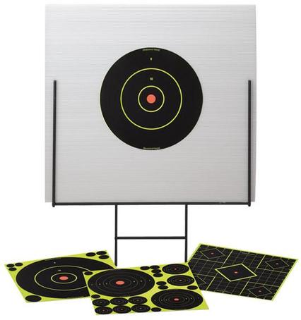 This convenient, easy-to-use shooting range comes with a supply of Shoot•N•C® targets and 18" x 18" weatherproof plastic corrugated backer! The range is perfect for rifles, pistols and shotguns and has a footrest for easily pushing it into the ground to prevent turning in the wind.