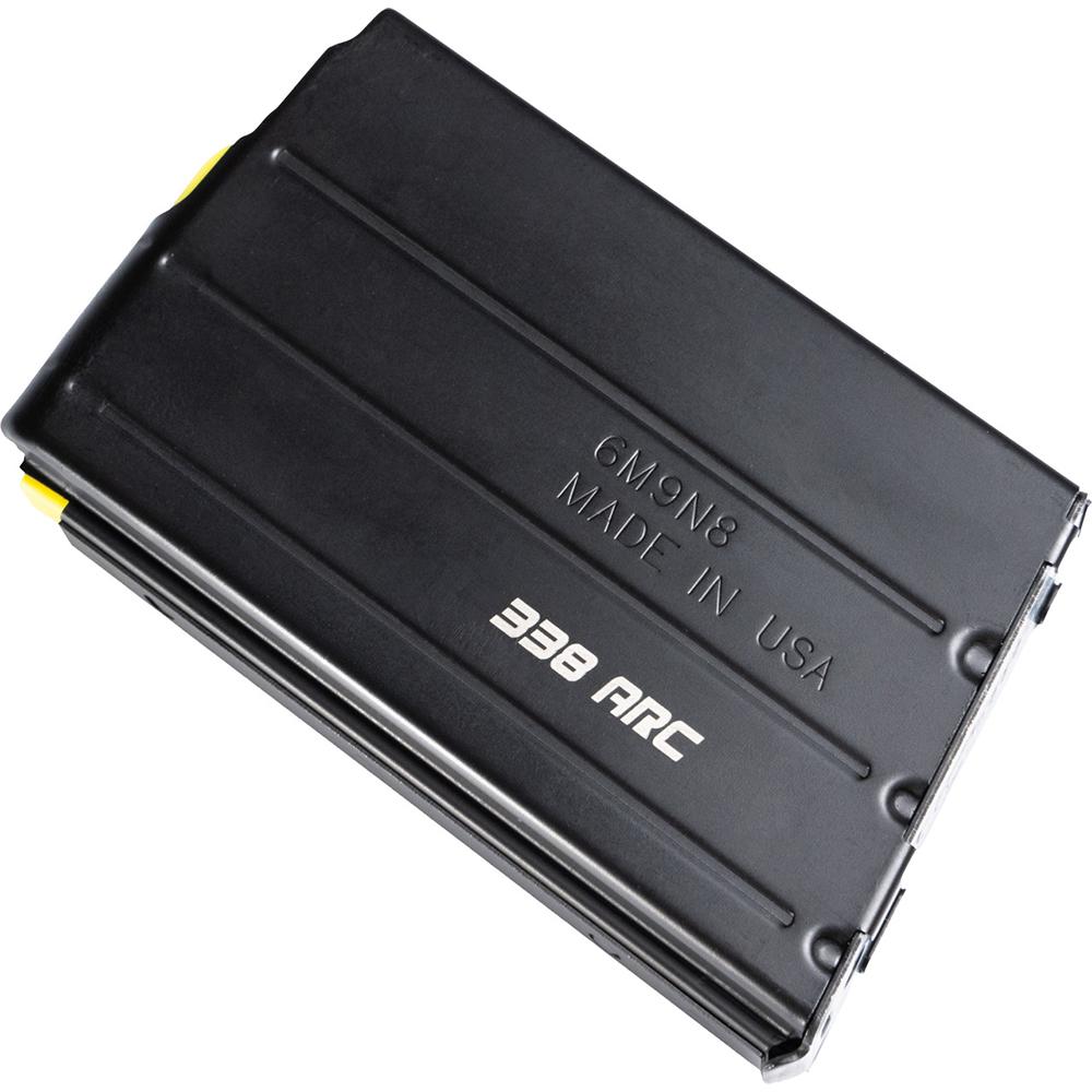 USA-made 10-round magazine for AR-15 platforms. Features high-visibility yellow anti-tilt follower and durable construction. Compatible with .338 ARC. State-compliant capacity and manufacturer warranty included.