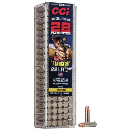 CCI Stinger isn't just a great load for pinning down varmints. It's also been one of the top choices of YouTube shooting sensation 22plinkster. That's why we've introduced special-edition “Stangers”—loads named for his signature drawl. Like the original, Stangers' 32-grain copper-plated hollow-point bullet leaves the muzzle at 1,640 fps and provide CCI's legendary precision and accuracy.