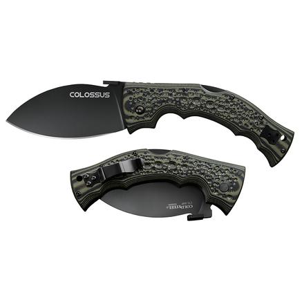 The Cold Steel Colossus is a cutting-edge folding knife that combines strength, precision and durability in a sleek package, ideal for avid adventurers and everyday carry enthusiasts alike. It features the brand’s renowned Tri-Ad locking mechanism, which ensures a secure and reliable lockup whenever the blade is deployed, giving you the confidence to tackle cutting and slicing tasks with ease. The 4" leaf-shaped blade is crafted from premium XHP steel, known for its exceptional edge retention and corrosion resistance, coated with a durable black DLC finish for added protection against the wear and tear that comes with repeated outdoor use and exposure to the elements. This razor-sharp blade features a hollow grind for superior cutting and piercing performance and is attached to an ergonomic G-10 handle that provides a comfortable and secure grip, even in wet, sweaty, or messy conditions. The scaled, textured surface delivers maximum control and stability, allowing for effortless handling through any undertaking.
