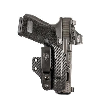 The #216, Lifeguard Holster, is our minimalistic IWB holster. It fully encloses the trigger guard, making it both safe and secure . The Lifeguard features a carbon fiber finish for a rugged look and is fitted with a Tuckable C-Clip allowing for maximum concealment.