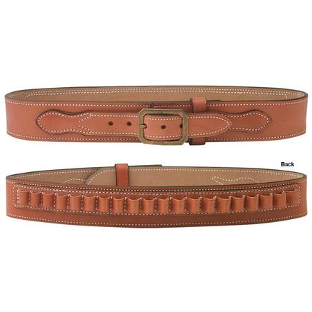 This belt is constructed from extra heavy premium saddle leather and is fully suede lined. The .45LC comes standard with 20 cartridge loops, while the .38/.357 caliber belt comes standard with 25 cartridge loops. The loops are centered on the backside allowing plenty of room for other accessories. Available in black or tan lined leather. Belt is 2 1/4" wide.