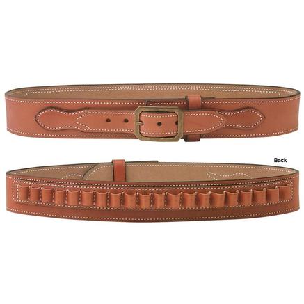 This belt is constructed from extra heavy premium saddle leather and is fully suede lined. The .45LC comes standard with 20 cartridge loops, while the .38/.357 caliber belt comes standard with 25 cartridge loops. The loops are centered on the backside allowing plenty of room for other accessories. Available in black or tan lined leather. Belt is 2 1/4" wide.
