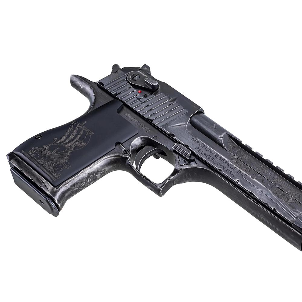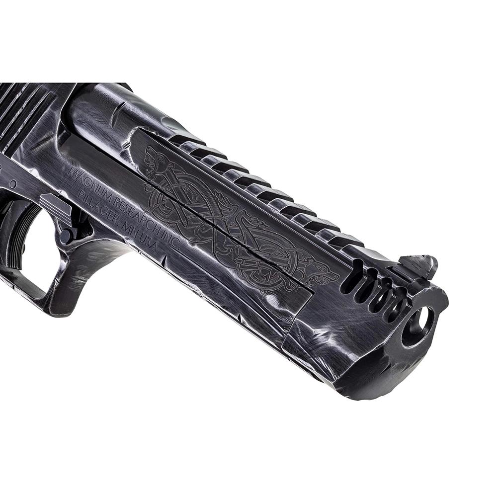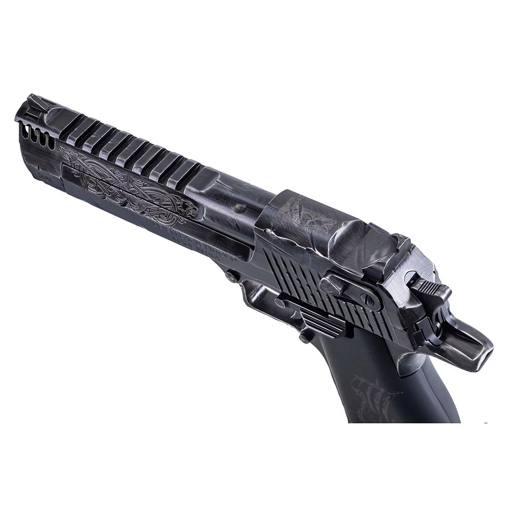 The distressed, battle-worn finish tells a story of glorious conflict, while the slide and barrel are deeply engraved with intricate, flowing knotwork reminiscent of ancient sagas carved in stone. This masterpiece is built upon the powerful and unmistakable Desert Eagle platform, ensuring legendary performance.