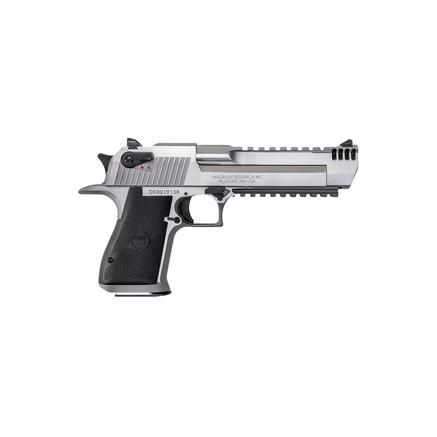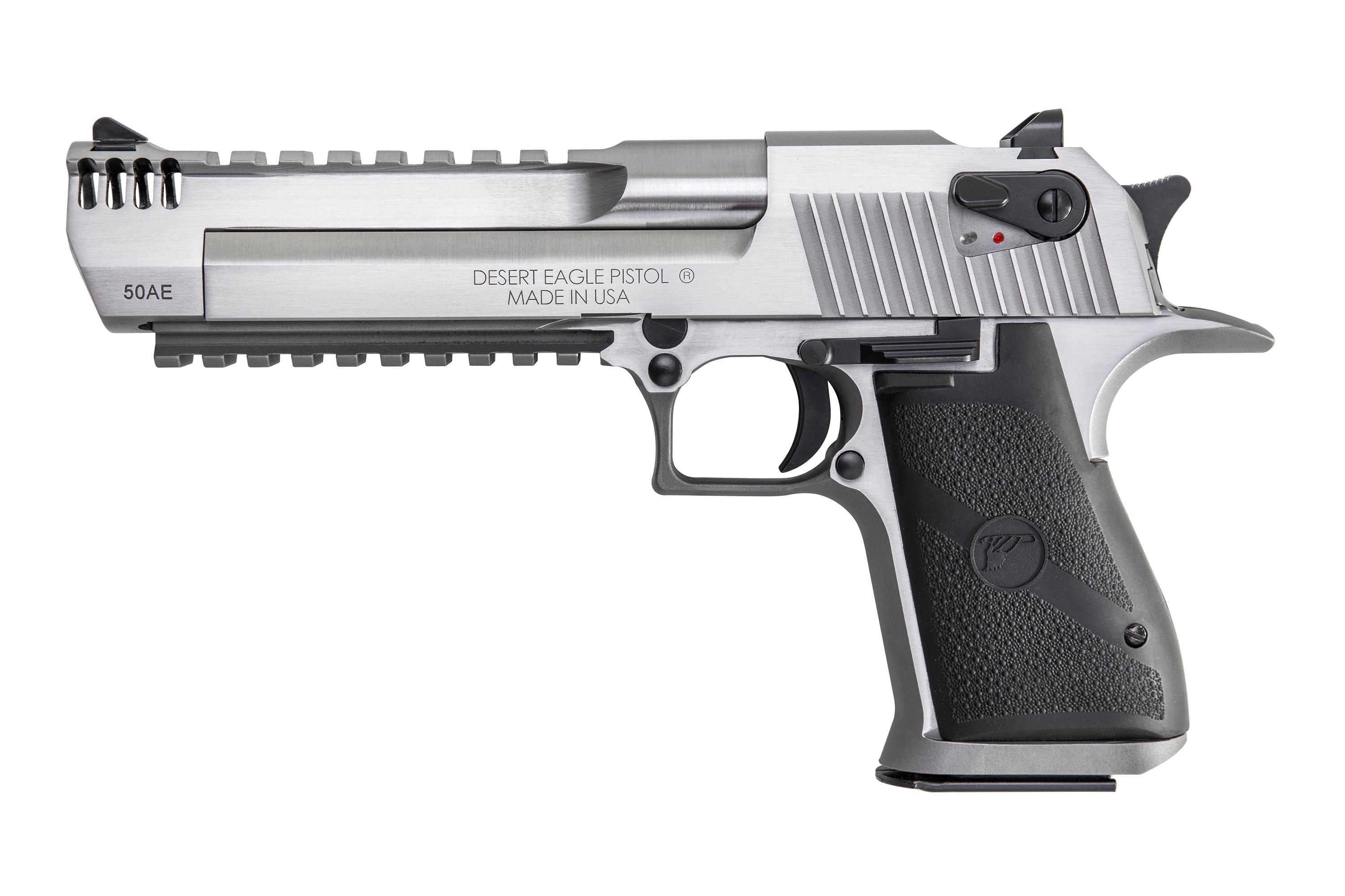 The Desert Eagle all stainless steel model is offered in a 6” with an integral muzzle brake. The integral muzzle brake offers significant recoil reduction, less muzzle flip and a new streamlined look. Desert Eagle Mark XIX Pistol, .50 AE, Stainless Steel with Picatinny Bottom Rail, Weaver Style Top Rail, Integral Muzzle Brake, Black Appointments. 6" barrel, 7 round magazine