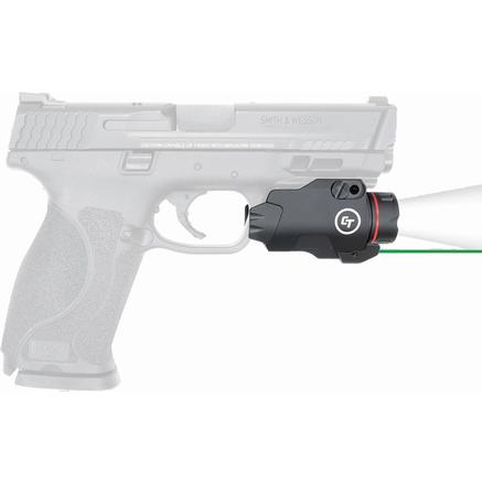 The Crimson Trace CMR-207G Rail Master Pro offers a powerful 400 Lumen LED white light and green aiming laser in a compact and durable unit. The CMR-207 features an aluminum body with ambidextrous activation points. User programmable modes of operation include: Laser + Light, Laser Only, Light Only. This Rail Master Pro features smart electronics that will power down the unit after 5 minutes, (preventing battery drain if activated during casing or holstering). Laser sight is fully user adjustable for windage and elevation. Powered by a single CR123 Lithium battery. Fits pistols, rifles and shotguns with M1913 Picatinny or Weaver-style accessory rails.