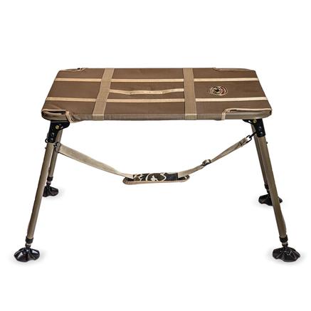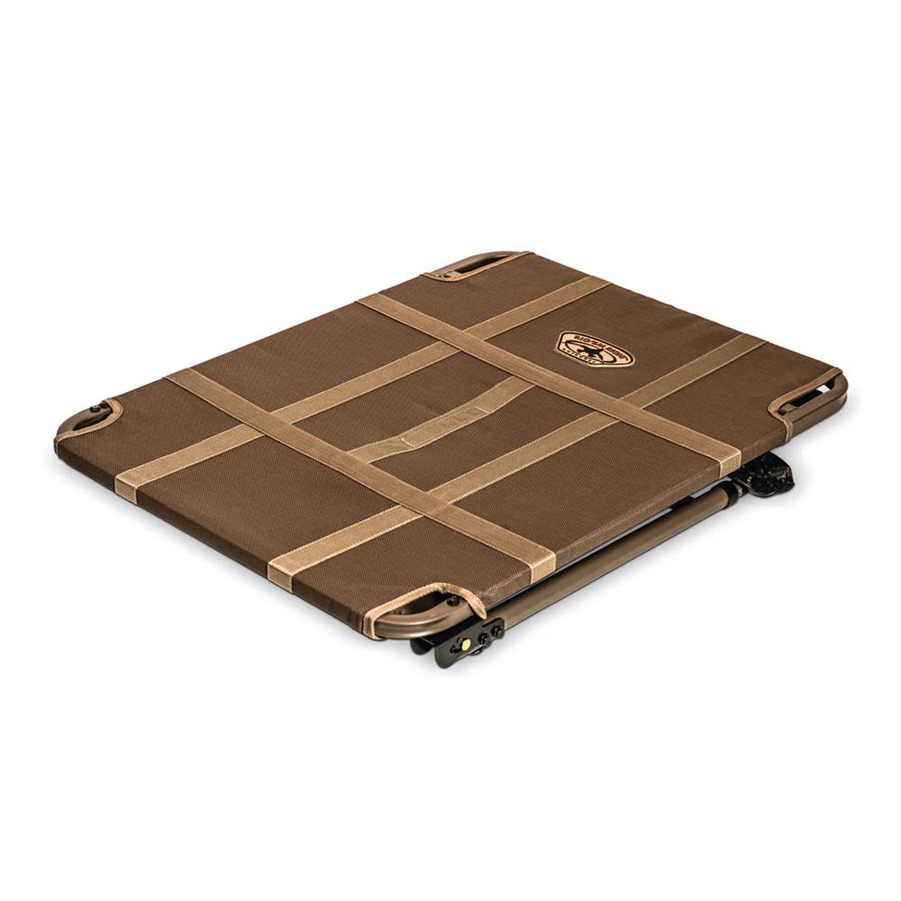 Rig'Em Right's Swamp Bully Dog Stand is the toughest, most durable and most trusted dog stand ever built. Lightweight and easy to carry, this stand folds flat in seconds, carries easily with the padded shoulder strap and metal D-rings. Sets up just as quickly without compromising stability. The powder-coated, matte-brown frame reduces glare, and each leg adjusts individually for uneven ground while the large footpads reduce sinking in the mud or marsh. The durable mesh top will drain water and can be adjusted for added tension for heavier dogs.
