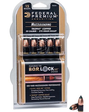 Speer TNT JHP Federal Premium is redefining modern in-line performance with the Trophy Copper Muzzleloader Bullet. Its exclusive B.O.R. Lock MZ System provides outstanding accuracy in a non-sabot design that's easy to load, scrubs fouling from the breech and ensures consistent bullet seating.