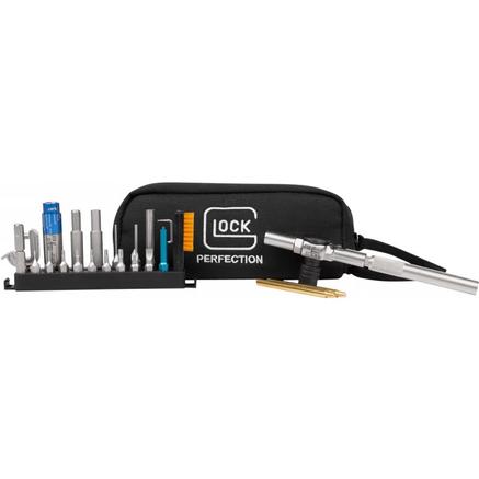 Recommended for Glock certified armorers. Glock Tool Kit includes- Ratchet T-Handle w/Locking Hex Drive, Mini All-In-One Torque Driver, 3/32" Pin Punch, 1/8" Pin Punch, Steel Pick, cleaning brush bit, Channel Liner Installation and Removal tools, Sight tool, Magazine Base Plate Removal tool, Battery Cap tool, two brass rods, Set of two 8-32 adapters, 10 Electroless Nickel Plated Bits: T8, T10, T15, P1, H2.5mm, H.050", H1/16", H5/64", 3/32" Extended Bit (for adjusting hard to reach screws on optics), SL6mm and a compact carrying case with molded bit holders designed to hold any 1/4" bit.