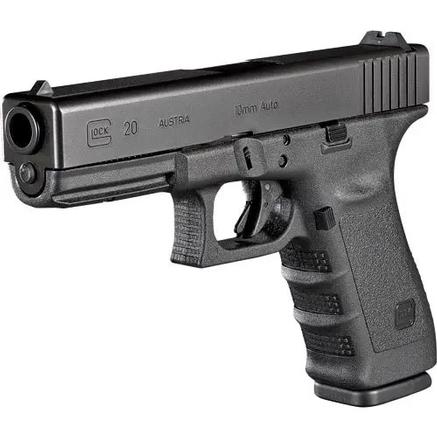 A semi-automatic handgun chambered in 10mm with a standard 15 capacity the Glock G20 Gen 3 was introduced in 1998 and featured an integrated accessory rail known as the Universal Glock rail. Other upgrades of this polymer-framed pistol included thumb rests on both sides of the frame and finger grooves on the front strap. Glock later improved on the G20 Gen 3 further by adding a modified extractor that doubled as a loaded chamber indicator as well as an enlarged locking block and an extra cross pin.