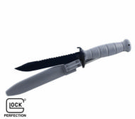 The Glock Field Knife / Saw Back survival knife is a perfect addition to any tool kit, field pack or belt. Developed in close cooperation with Austrian Army Rangers, the no-nonsense GLOCK knife features a tough 6 1/2 inch carbon steel clip point blade and molded polymer hilt, tough enough to break windows or cut through the toughest tree limb, yet perfectly balanced for appropriate conditions. The one-piece polymer sheath is ideal for keeping the 3/16 inch blade protected. The set includes an integral retention system to keep your GLOCK knife secure during times of extreme activity. Fits up to 2-1/2" belt.