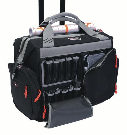 Our newest range bag features a first in Range Bag technology, oversized ATV wheels, a wide mouth top opening and a telescoping handle for easy transport. Why not have all of your heavy ammo, pistols and shooting gear in a wheeled range bag? We have incorporated our Visual ID Storage System into this new bag. All components of our storage system including storage pockets for Eye and Ear protection,Targets, Stapler, Tape, Binos, Tools, Cleaning supplies, Extra Magazines, and an innovative fold out Vertical Handgun Holder. This new handgun holder allows the shooter to store two medium or small frame handguns inside the bag in a secure vertical storage format that allows better organization at the range. We constructed this new Rolling Range bag with the same strong materials used in making better grade luggage. A rigid internal frame with 6 metal rivets ensure it’s long term durability. Bigger is Better!