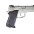 This single-piece grip slides on revolver frames from the bottom, requiring no modification to the firearm. A patented steel "stirrup" device clips over the existing stock pin or bottom strap of the frame. The stirrup is the key component in the system that adapts the grip to the gun handle. Monogrip allows a high handhold on the backstrap which lowers the bore line, reducing muzzle rise in recoil and aiding rapid-fire recovery time, especially when using a two-hand hold. Palm swells are ambidextrous, allowing equal comfort and control for either right- or left- handed shooters.