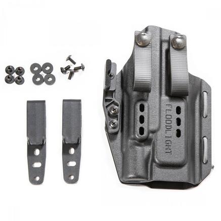 The Floodlight, like the Skeleton, is ambidextrous and can be worn AIWB or strong-side IWB, using either soft loops or clips (included). Reduced, lower-profile ergonomic molding improves comfort in a variety of carry positions and provides an ideal attachment point for your choice of aftermarket ergonomic wedge or DIY solution.