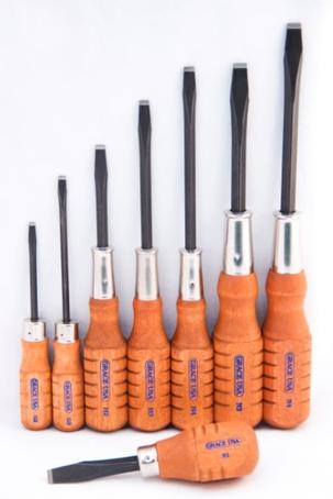 GRACE USA 8 Pc Original Gun Care Screwdriver Set was in your grandfathers gun repair box. This is the set that started it all in 1941 and continues to be a best seller. Each GRACE USA Gun Care Screwdriver is custom hollow ground to fit scope screws, plug screws, guard screws, floor plate, sight screws, and many other gun screws. This process is very precise and we hold our tollerance to -.002 +.000 so we get an exact screwdriver tip to screw fit. Edward C. Grace, founder of Grace USA, also owned a gunsmith shop and was determined to create a screwdriver that would be a functional tool for this industry and it continues strong to this day. The square shanked blades are hardened to R/C 52-56 and are waranteed under our Forever Guarantee not to twist or chip. The screwdriver handle is another important component to this tool. It is turned in Maine to our exact qualifications from Maine hardwood and protected with a nicely stained finish. A quality wooden handle is key to a good grip with hands becoming slippery from oil when working with firearms and these Grace USA screwdrivers provide that great wood handle feel that only gets better with time. 100% Made in the USA