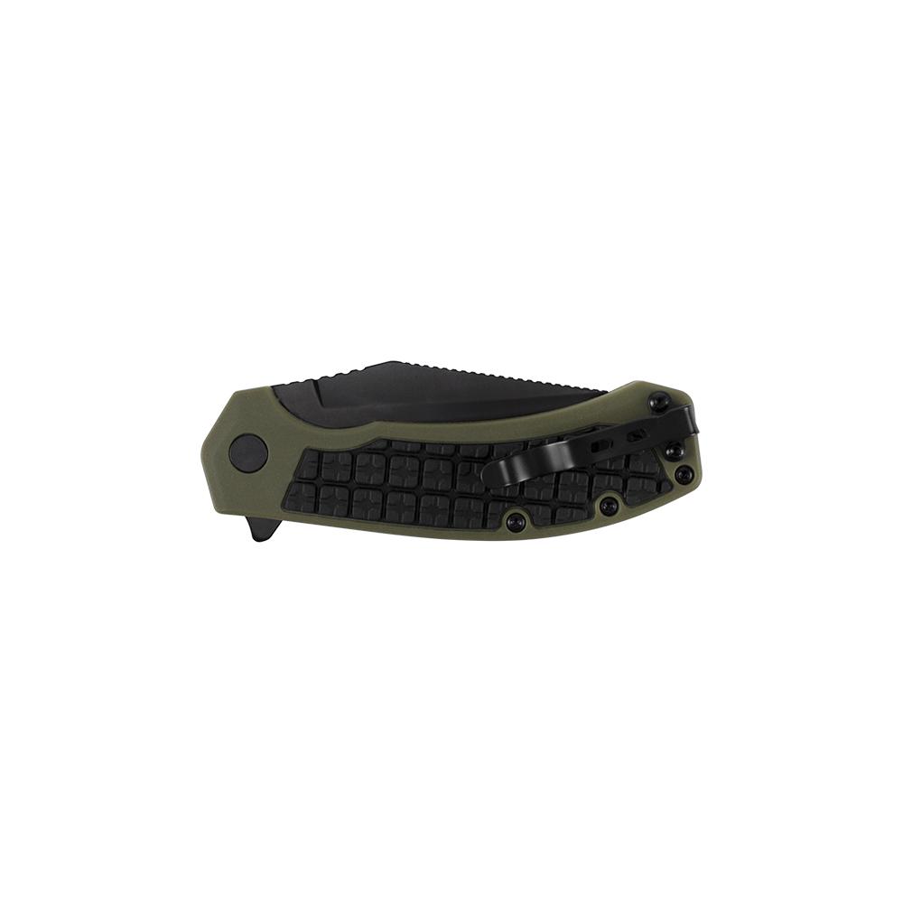 - Olive drab glass-filled nylon handle with rubberized, textured overmold and heavy blade back jimping add grip