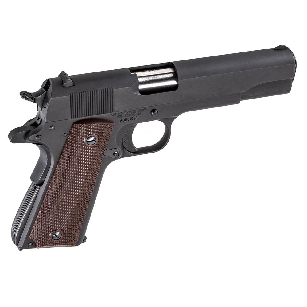 The Auto-Ordnance 1911A1 series incorporates GI specs, and features a matte black finished frame, barrel, and slide. The precision manufactured, carbon steel slide, sear, and disconnector are heat treated properly for durability over many thousands of rounds. The low-profile sights feature a blade front sight and a rear drift adjustable for windage. The grip is brown checkered plastic.