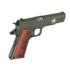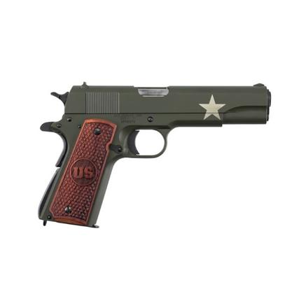 Each Tanker 1911 slide and frame are Cerakoted in Army O.D. Green. The iconic white star of the Sherman Tank is engraved on the slide and frame, adding a touch of historical character. The “U.S” logo is engraved on the beautiful, checkered wood grips, providing a natural and elegant look. This all steel, GI style 1911 features a 5” barrel, chambered in .45 ACP. Sights, trigger, grip safety, and controls are the classic GI pattern. One seven round magazine is included.