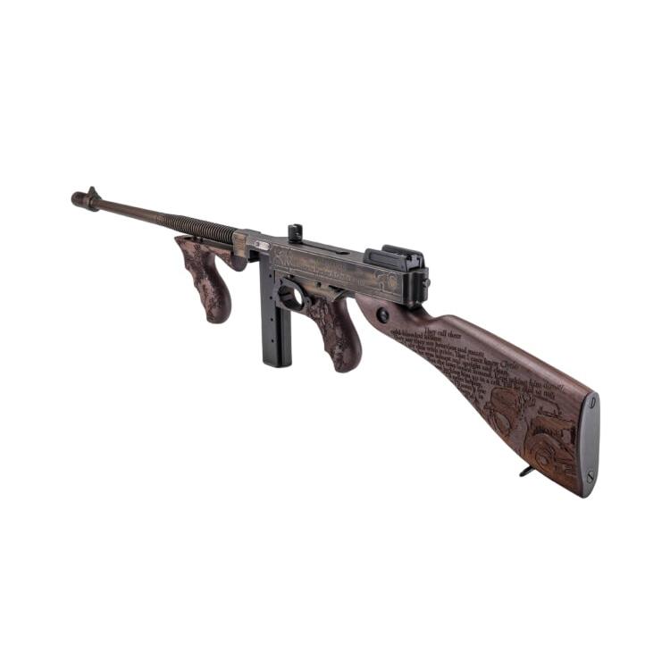 Auto-Ordnance continues the legend with this custom finished and engraved “Bonnie and Clyde” Thompson. Each of these Tommy Guns are engraved with reminders of the outlaw duo’s escapades, including photos, a wanted poster, and news headlines. The stock features text from Bonnie’s famous poem “The Trail’s End”, foreseeing their crimes would not pay. The grip is engraved with the badge of the Texas Rangers, in commemoration of the legendary Frank Hamer’s leadership stopping the outlaws.