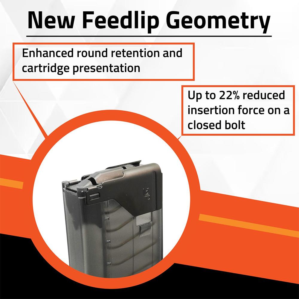 Featuring a precision engineered, hardened steel feedlip geometry and advanced floorplate lock design, the L5AWM GEN 2 delivers optimized cartridge stacking, enhanced round presentation, exceptional round retention, and bulletproof feeding performance and reliability.