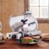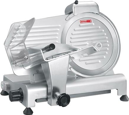 Perfect deli cuts of your favorite boneless meats are always within reach thanks to this heavy-duty commercial grade slicer. Finely honed blade rarely needs to be sharpened, even with frequent use. A sharpener is included for when it comes time for sharpening. Sliding carriage and food holder arm ensure consistently smooth and precise cuts. To adjust thickness, just turn the graduated knob. This slicer will slice as thin as 1mm or as thick as 10mm (.4") and any thickness in-between. Strong 0.4 HP motor. Skid-resistant rubber feet. Replacement belt and replacement blade sharpening stone included. Note: Not suitable for slicing frozen foods or non-food items. ETL Certified. ETL Sanitary Certification.