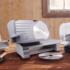 This 8-1/2" meat slicer includes two blades and a handy built-in tray to catch sliced meats. Use the standard blade for deli thin cuts or the serrated blade for crusty breads or fibrous meats. The sturdy aluminum base and suction cup feet make this reliable slicer easy to use. Removable handguard/food pusher to keep fingers safe. Carriage removes easily making cleanup a snap. Includes pulse function and two blades. Cutting thickness up to 3/4". ETL certified.