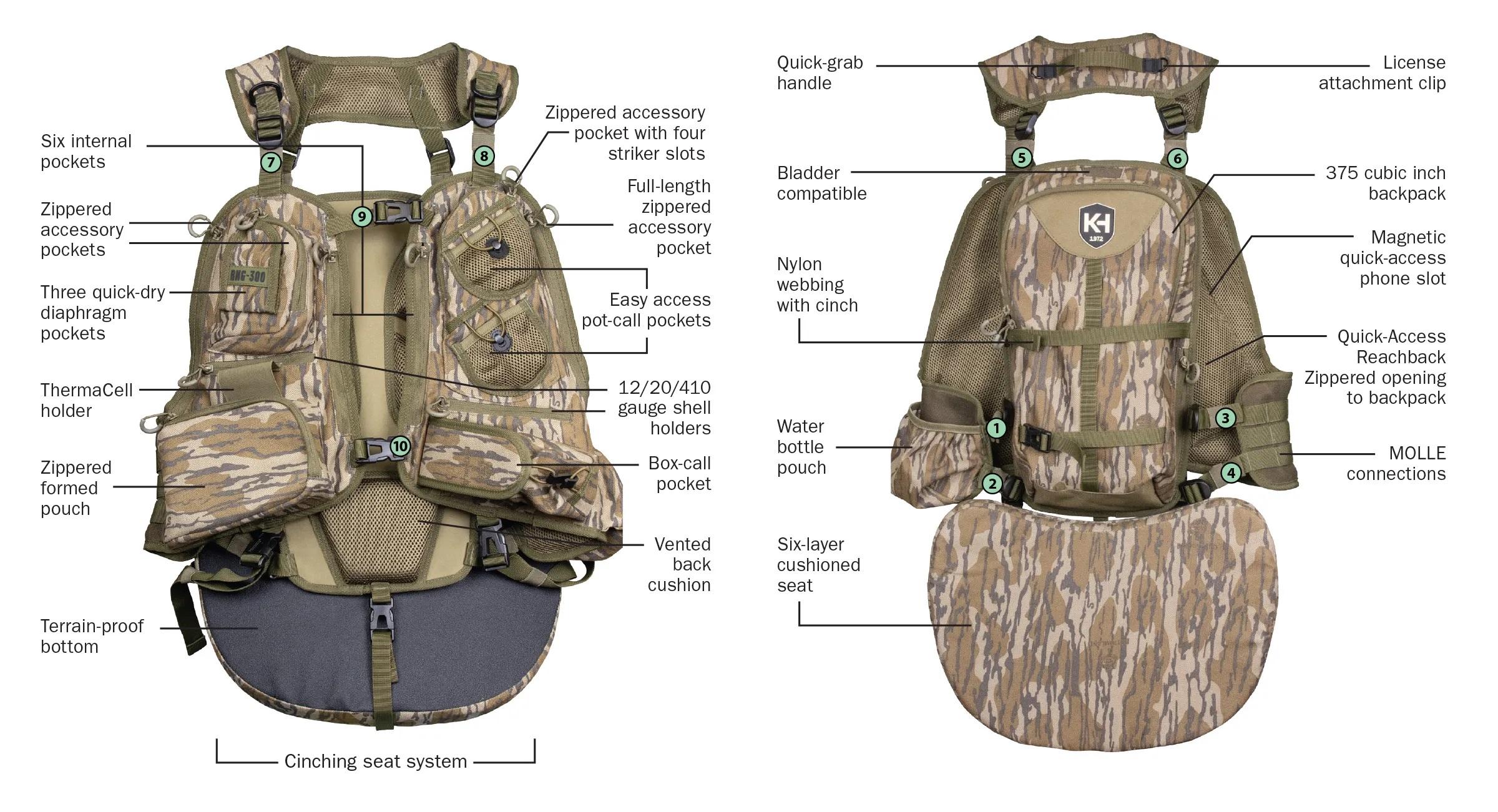 The Run N’ Gun 300 offers an immense level of storage. Featuring nine zippered pockets, a 375-cubic-inch backpack capable of holding a water bladder, designated spaces for pot calls, mouth calls, a box call, strikers, 12/20/410 gauge shotgun shells, a Thermacell, a phone, and a water bottle for good measure – the question isn’t “What should I leave behind?”, it’s “Why should I leave anything behind?”