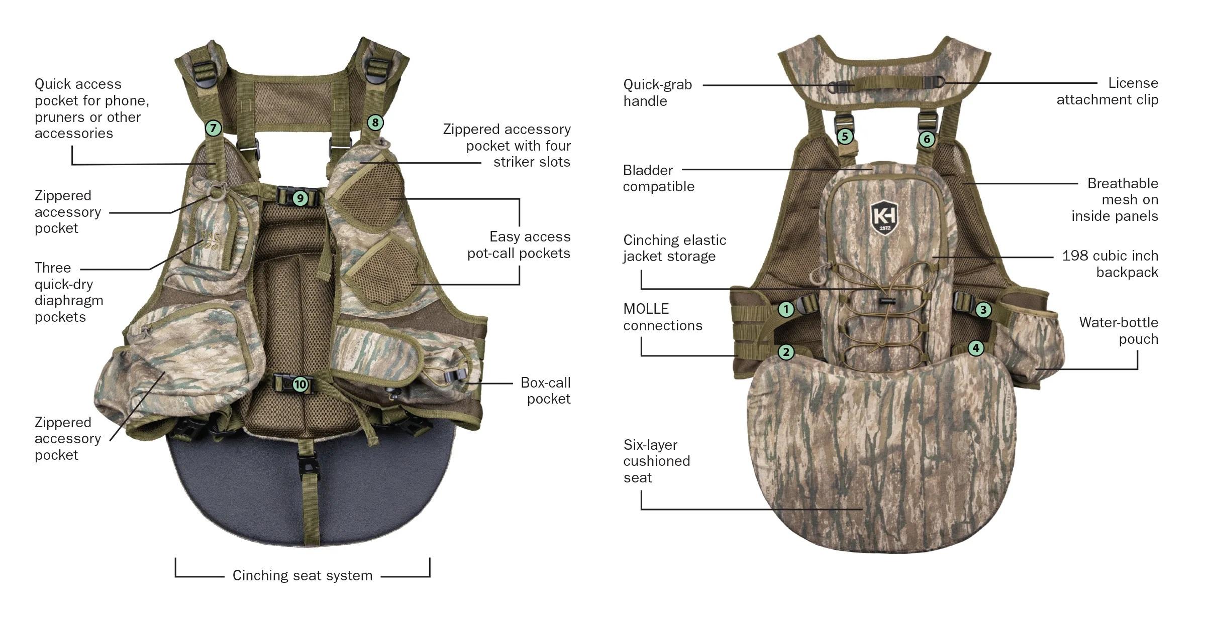 For gear storage, the vest features four zippered pouches and five additional pockets for easy access to pot calls, box calls, strikers, diaphragms, your phone, and any other accessory a turkey hunter could need. The incorporated MOLLE system allows for added pouches and more. You'll also get a decoy sling. Using a slip knot around the decoy's neck and a set loop around the tail, the decoy sling can be quickly thrown over your head to keep decoy(s) secure against your back while you chase birds.