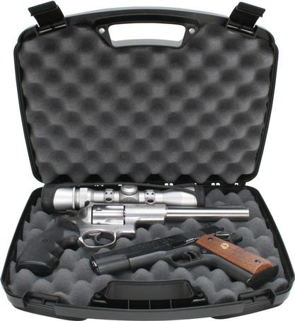 MTM’s Snap Latch, Handgun Cases offer durable construction, reliable snapping latches and a large comfortable handle. Each is made of rugged polypropylene with a handsome textured finish. Thick foam padding and double padlock tabs are provided for the utmost in protective security. 809 Holds two handguns with barrel lengths up to 8” long. Firearms are securely held in place with two pieces of high-quality, convoluted foam padding.