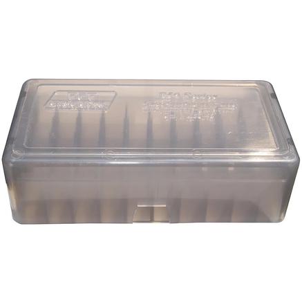 MTM has two styles of ammo handgun slip boxes, the E-50 and J-50 series. They both hold 50 rounds. The E-50 series has a non-textured surface and has square holes go to Next Product for information on the J-50 series.