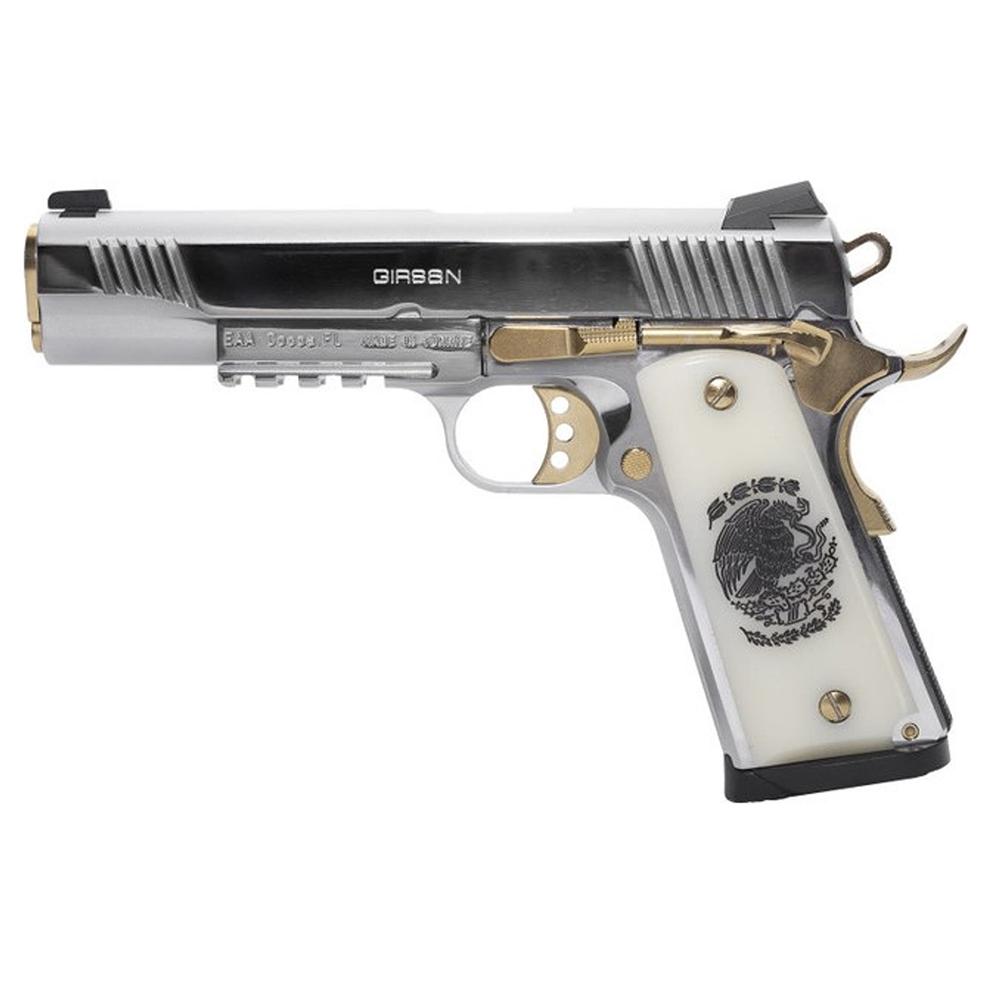 The EUROPEAN AMERICAN ARMORY Girsan MC1911 Liberador II Pistol features a polished stainless-steel slide and frame, matched with polished gold controls and engraved grips, adding an element of cultural significance to this beautiful pistol chambered in 9mm (Government 5") with an adjustable rear sight. With a 9 magazine capacity, the MC 1911 Liberador II is complete with ambidextrous safeties, an accessory rail, 3-hole trigger, front cocking serrations, extended beavertail and a magazine well.