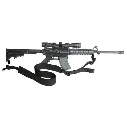 Allows the shooter to adjust the overall length of the sling for a rapid transitions from strong side to support side and back. Designed for muzzle down carry. Place the sling diagonally over your shoulder and under the opposite arm, access the free running end of the sling under your arm and easily switch to your opposite shoulder without having the sling tighten on your body. Quickly adjusts to several different shooting and carry positions. 800 pound laboratory certified tensile strength, US military application, two-inch wide razor-thin elastic material eliminates neck pinch and disperses the firearm weight; thereby, reducing fatigue Excellent for all tactical weapons.