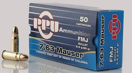 PPU Handgun Ammunition 7.63mm Mauser 85 gr FMJ 1510 fps 50/ct