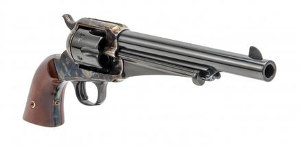 Designed to compete with Colt's 1873 single-action, the 1875 Remington revolver has a similar, yet distinctive look all its own. Around 25,000 of these sleek six-shooters were turned out from1875-1889, and were held in high esteem by many Westerners, including none other than the notorious outlaw Frank James, who praised its handling capabilities, as did noted 1880sTexas Ranger Bill McDonald. It was also the choice of the U.S. Department of the Interior, who purchased several hundred in 1883 as an issue sidearm to Indian police on frontier reservations. Cimarron's 1875 Outlaw is available in either the 5 1/2-inch or the 7 1/2-inch barrel lengths. Calibers offered are .357 Magnum/.38 Special, .44 WCF, or .45 Colt (7 1/2-inch is also offered in .45 Colt/.45 ACP with dual cylinders) The '75 Outlaw comes in Standard Blue with a color case hardened frame and hammer. Cimarron's 1875 Model has captured the looks and feel of this frontier smokewagon that has also been catching on with today's silver screen cowhands and has seen use in such popular westerns as Open Range, Broken Trail, and 3:10 To Yuma. The Outlaw is a true Western classic!