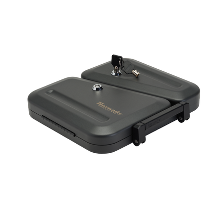Keep two handguns secure or store ammo safely and separately from your firearm in one space saving, easy-to-carry lock box. This unique design provides two spaces in one, each with a separate lid and keyed alike lock. The built-in handle makes it simple to transport.