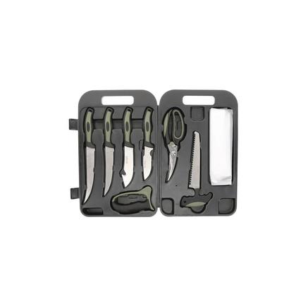 Old Timer Outdoor Kit has all the tools a hunter need in order to fully break down and process game. Each knife is designed with a comfort grip rubber handle and an included sharpener for repeated use. The durable roto-molded case with built in cutting board is easy to clean while protecting the gear inside no matter where the hunt takes you.