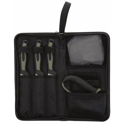Old Timer Field Dressing Kit has the necessary tools a hunter needs to throw in his pack and process game in the field in one convenient location. Each knife is designed with a comfort grip rubber handle and an included sharpener for repeated use.