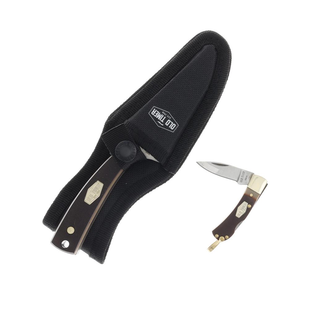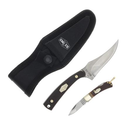 The Old Timer 2-Piece Sharpfinger and Lockback Knife Set is a rugged, dependable combo designed for hunters, outdoorsmen, and collectors who value traditional craftsmanship paired with modern durability. This set includes a Sharpfinger fixed blade knife and a Lockback folding knife, each crafted with brown sawcut Delrin handles that provide a secure grip and a classic appearance. The Sharpfinger’s 3.25-inch stainless steel clip point blade features full tang construction and a satin finish, offering strength, precision, and corrosion resistance for a variety of outdoor tasks. Its full tang design ensures long-lasting durability, while the plain edge delivers clean, controlled cuts ideal for skinning, field dressing, or other detailed work in the field. A polyester sheath with a belt loop is included for convenient carry, and a lanyard hole adds additional versatility for securing the knife in outdoor environments.