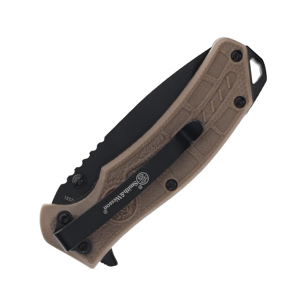 The knife included in the combo is the Smith & Wesson Hostage Rescue Team folding knife, engineered for reliable everyday carry and tactical use. Measuring 7 inches overall with a 3-inch high carbon stainless steel blade, it features a tanto point for piercing and precise cutting. The blade is coated in black oxide for corrosion resistance and a tactical, low-glare finish. Its plain edge allows for efficient slicing, while the thumbstud and flipper opener provide quick, smooth one-handed deployment. A liner lock keeps the blade securely in place during use, and the tip-down pocket clip allows for safe, convenient carry. The brown polymer handle is ergonomically designed, offering a secure and comfortable grip, even in wet or slippery conditions.