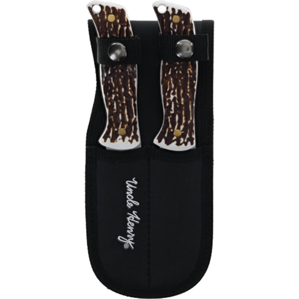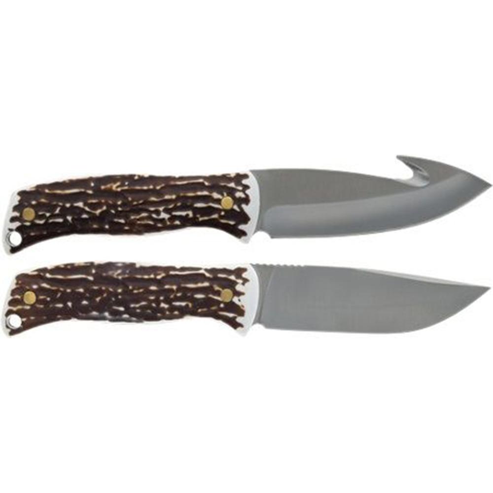 The Uncle Henry 2-Piece Fixed Blade Hunting Knife Combo delivers two classic, dependable field knives designed for hunters who value durability, control, and traditional styling. Both the gut knife and caping knife feature 4.2" satin-finished stainless steel blades that hold an edge well and resist corrosion in demanding outdoor conditions. Each knife is fitted with a 4.6" Staglon handle in a rich brown finish, offering a secure, comfortable grip with the timeless look of traditional hunting knives.