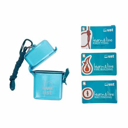 UST’s Learn & Live Cards – Outdoor Skills Set quick reference guides cover three of the six imperative survival skills: knot tying, way finding, fire building, first aid, shelter, and fishing. They’re all housed in UST’s Watertight Case 1.0, which features O-ring seals for durability and water-resistance. Part of UST’s Learn & Live reference card collection, this set offers a convenient and fun learning tool for everyone — from seasoned backpackers and first-time campers.UST’s Learn & Live Cards – Outdoor Skills Set quick reference guides cover the fundamentals of six imperative survival skills: knot tying, way finding, fire building, first aid, shelter, and fishing. They’re all housed in UST’s Watertight Case 1.0, which features O-ring seals for durability and water-resistance. Part of UST’s Learn & Live reference card collection, this set offers a convenient and fun learning tool for everyone — from seasoned backpackers and first-time campers.