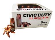 Typical bonded hollow point bullets over penetrate, leading to insufficient energy transfer, damage and trauma inside the intended target. G2 Research has taken its innovative Trocar design of the solid copper R.I.P. fragmenting projectile and adapted it to the G2 Research Civic Duty expanding self-defense round. The Civic Duty round defeats barriers as effectively as the R.I.P. and expands 2.5 times its initial diameter after coming into contact with a fluid medium. The Civic Duty round expands to transfer 100% of its energy to the target. The Civic Duty Round retains 99.9% weight inside the intended target without concern of over penetration in CQB situations.