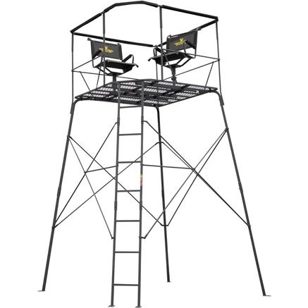 The Rivers Edge 12’ 2-Man Quad Pod is a rifle hunters dream tower stand. The oversized 57.5” x 57.5” platform offers a comfortable amount of room for you and all of your hunting gear. The 12’ 2-Man Quad Pod allows use of one or two independent swivel TearTuff mesh seats. This allows you to either hunt solo while centered on the platform or hunt two people side-by-side. Each TearTuff mesh seat features their own additional height adjustment to suit your needs. In additional each seat swivels 360-degress allowing you to check your surroundings. The 12’ 2-Man Quad Pod is built with steel tubing and cross-bracing that provides you with unmatched strength and durability and features a weight rating of 500 lb. The 12’ 2-Man also features an adjustable padded shooting rail with 6” of adjustment, so you can set the height that works best for you. Keep your tower rock solid when you install the included ground stakes. Own the field this hunting season when you relax in the comfort of the Rivers Edge 12’ 2-Man Quad Pod.