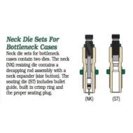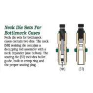 Redding neck die sets for bottleneck cases contain two dies. The neck (NK) resizing die contains a decapping rod assembly with a neck expander (size button). The seating die (ST) includes bullet guide, built in crimp ring and the proper seating plug.